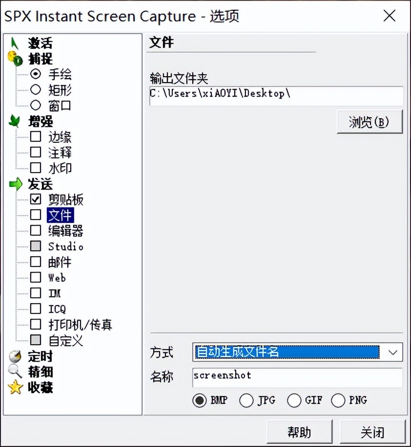 截图完的动作支持发送到剪贴板、保存为文件(支持BMP、PNG、JPG、GIF)、而且可以自动生成文件名,省去每次要输入的烦恼,还有固定文件名。