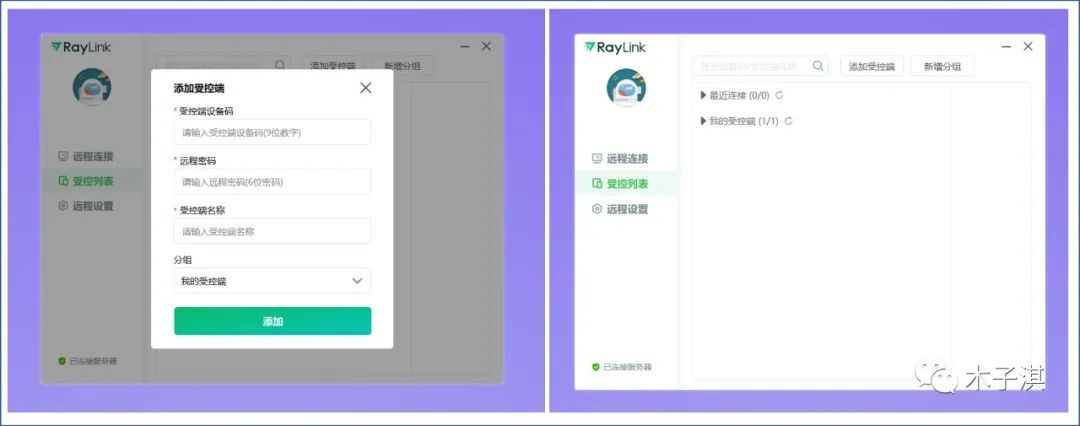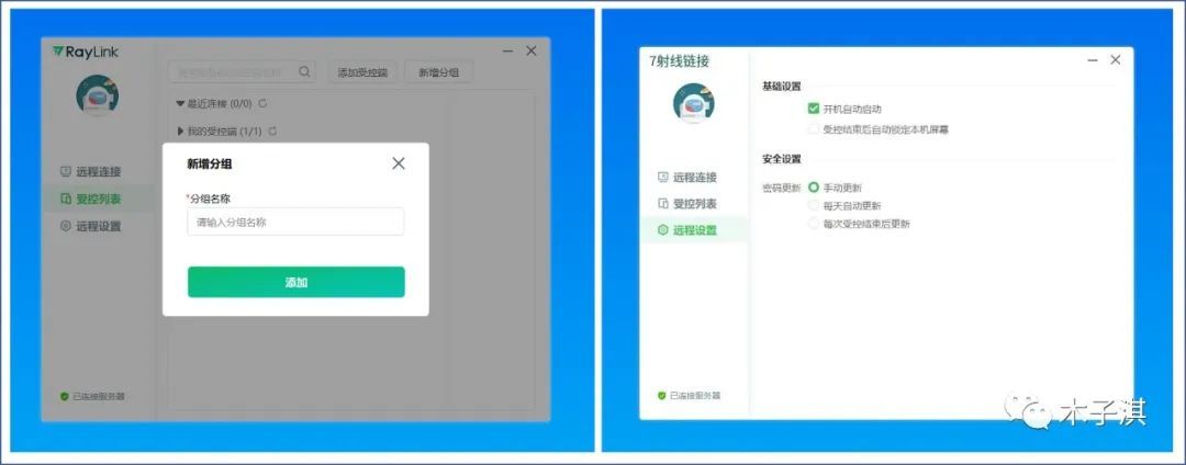它支持一台设备同时远程控制多台设备,也支持一台设备同时被多台设备远程控制;它的受控列表板块支持的功能包括:最近连接设备、我的受控端设备、添加受控端设备、新增分组。