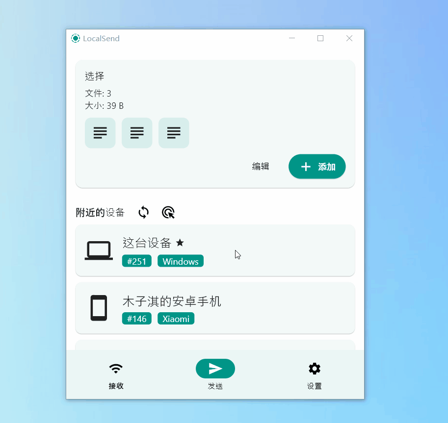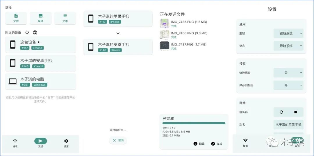 不同平台的设备都可以安装这个软件,每个设备都可以设置一个名字,所有设备都可以在发送板块查看。