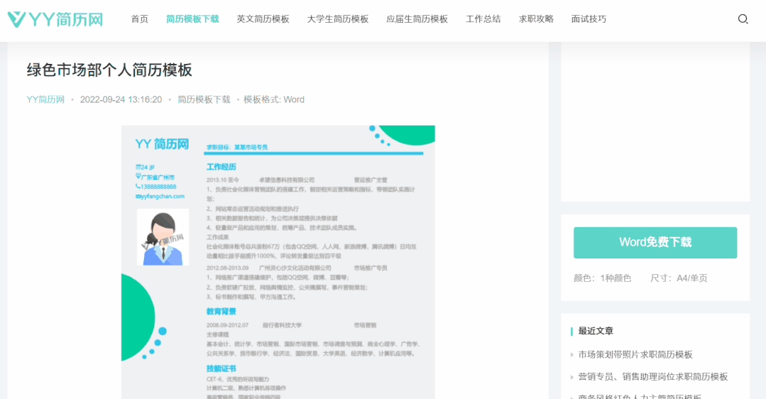 YY简历网是一个完全免费的在线简历模板工具。