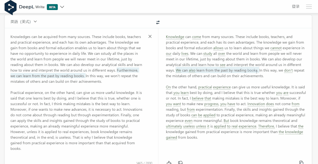 它使用非常简单,目前支持的语言包括英语和德语,输入或粘贴文本内容,稍微等待,右侧就会自动展示人工智能修改好的文本内容。