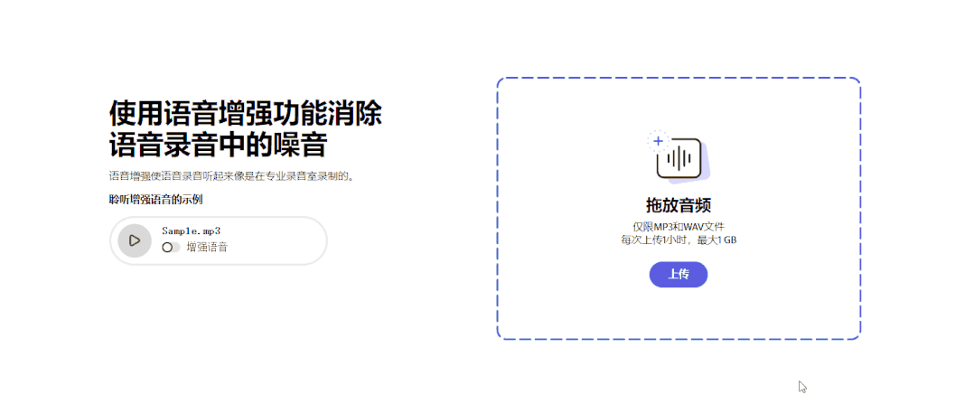 它支持上传 MP3 格式和 WAV 格式音频,最大 1 小时,最大 1GB 音频;它的上传速度和处理速度都是非常快,并且去噪效果非常出色。