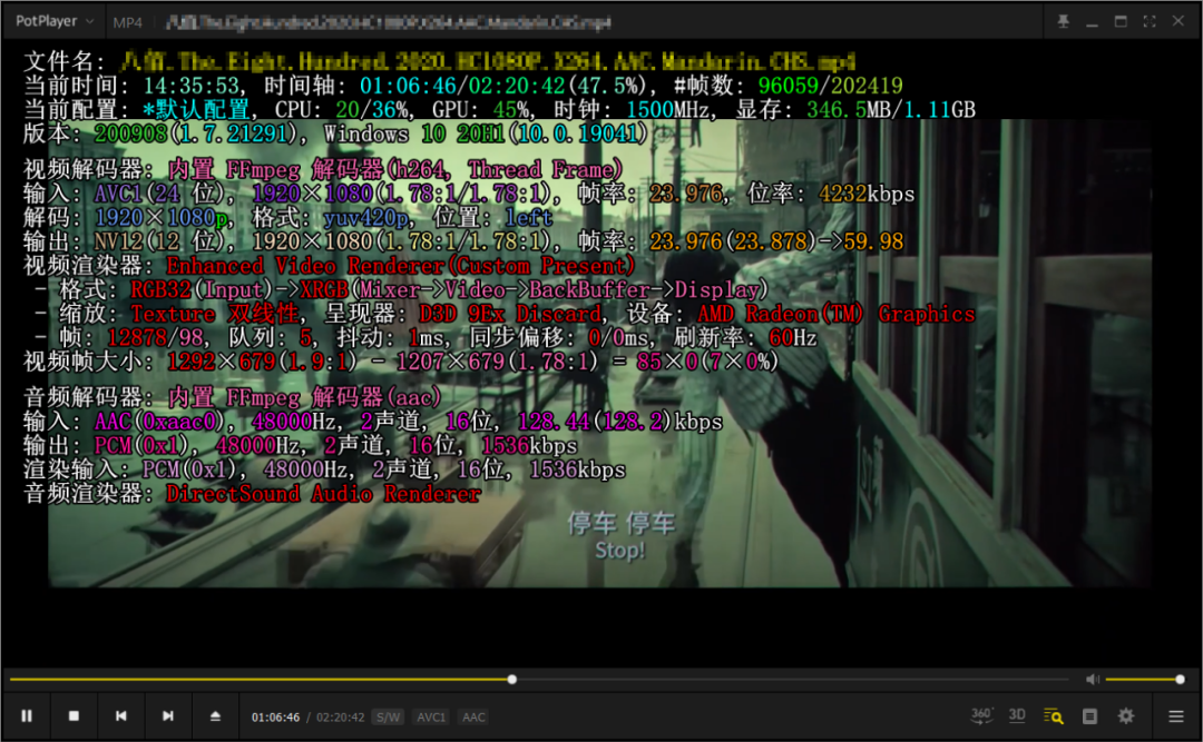 4.到这里正常情况下播放视频可以自动补帧了,播放过程中,按快捷键 TAB 显示影片详细信息,可以看到帧率变成59.98,也就是60帧了。