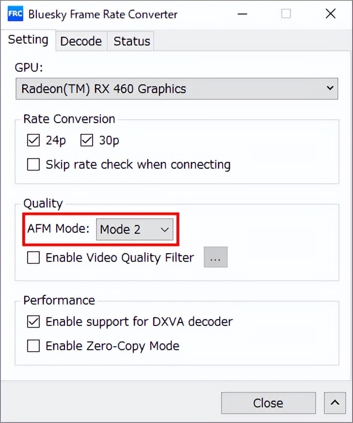 在 Quality 的 AFM Mode 选择 “Mode 2” ,勾选 “Enable support for DXVA decoder” 然后关闭软件并重启下系统。