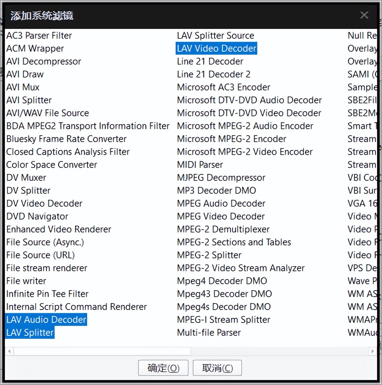 3.找到 “LAV AUDIO DECODER” 、“LAV SPLITTER” 、“LAV VIDEO DECODER” 选中,点击确定。