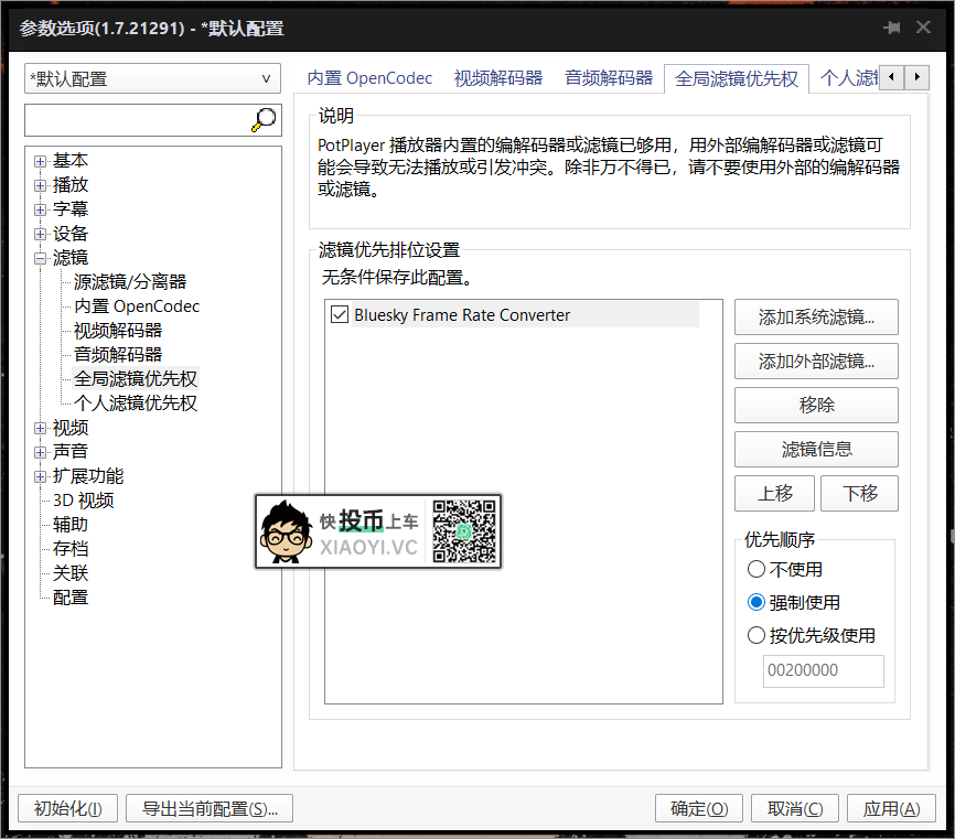 3.选中添加的 “Bluesky Frame Rate Convertera” 勾选 “强制使用” 。