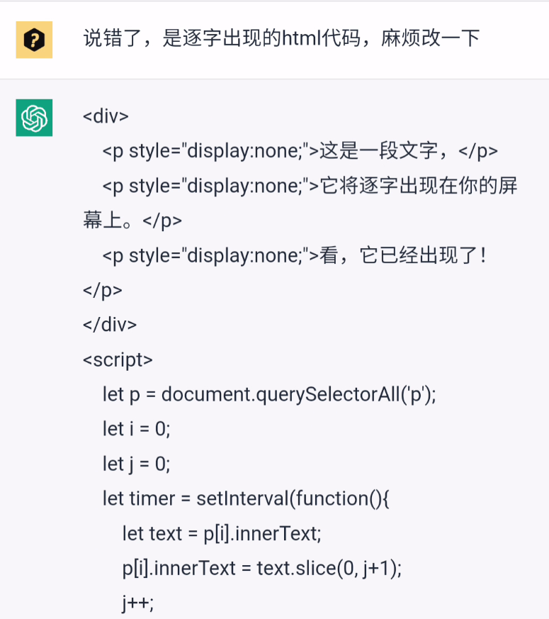 像是这种简单的要求,让它生成逐渐出现的代码,ChatGPT完全能理解,几秒钟就处理好了。
