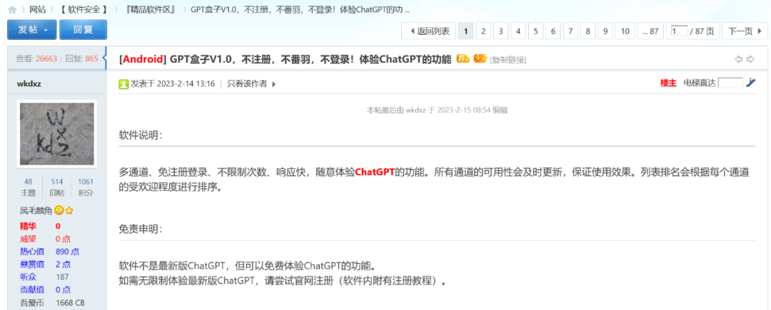 于是有朋友在导航站点专门建立了一个分区,专门收集免费的ChatGPT的地址,而吾爱论坛的朋友也出手了,将这些地址打包成了一个安卓端的“ChatGPT盒子”,软件的口号就是:多通道、免注册登录、不限制次数、响应快,随意体验ChatGPT的功能。