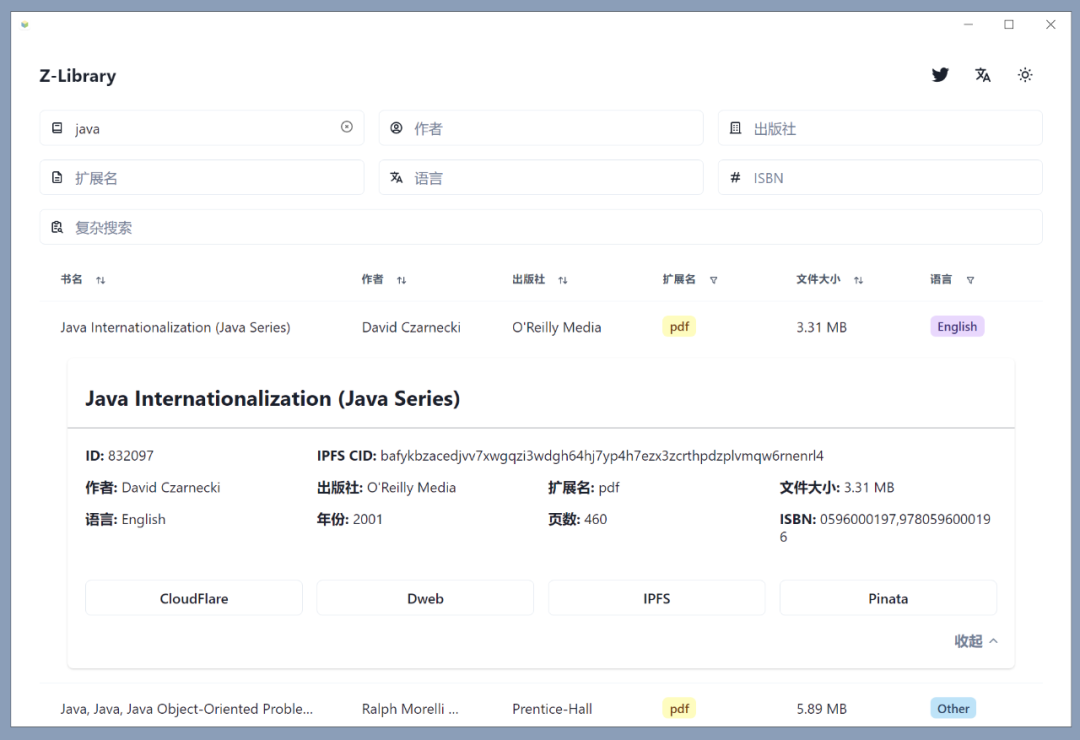 点开结果会显示详细信息,主要是作者和出版社,文件格式以及文件大小。页数与ISBN有些是空的,搜索的时候也可以尽量将信息极可能多的填写,结果会越准确。