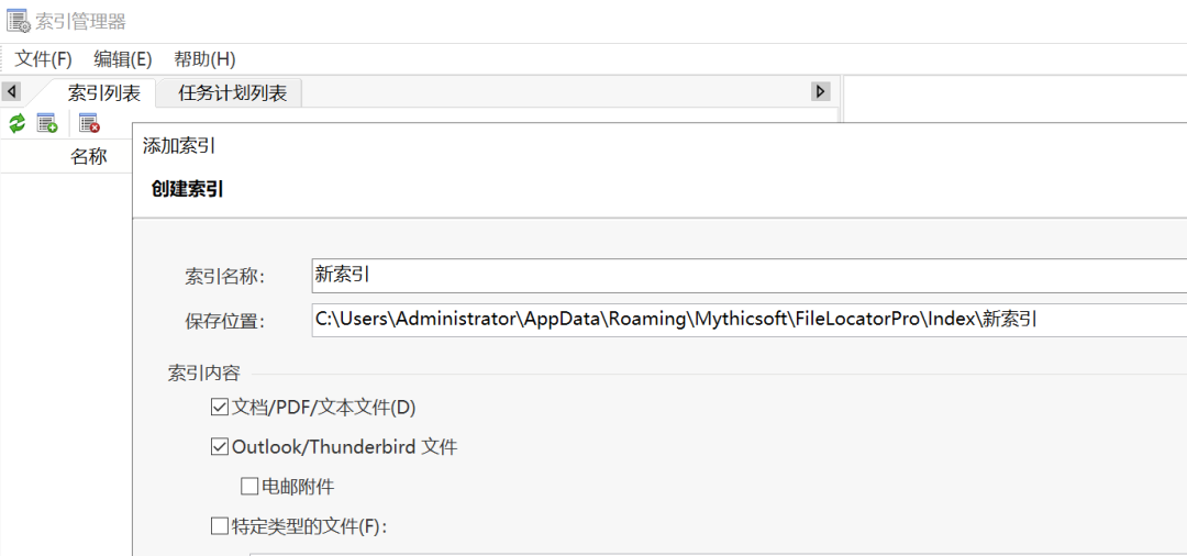 一般情况下,这些文件类型我们拿来搜索文件里是够用的,在使用之前,我们需要配置一下它的索引范围。在软件的右上角,双击那两个输入框,就会弹出来编辑的界面,在这里添加一个目录,可以为每个目录选择不同的文件类型。
