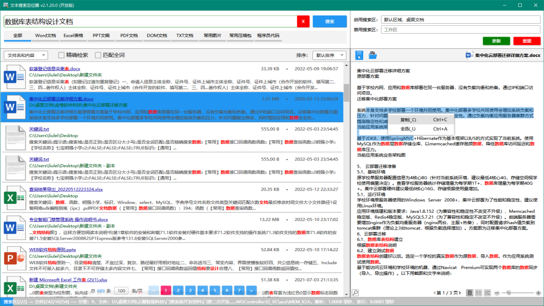 好了,说回全文搜索,根据TextLocator的界面显示,它可以搜索的内容有Word文档、Excel表格、PPT演示、PDF、DOM、TXT、图片、压缩文件与代码(PHP\md文件\c文件和java等等)、文件名和附加的时间信息什么的。