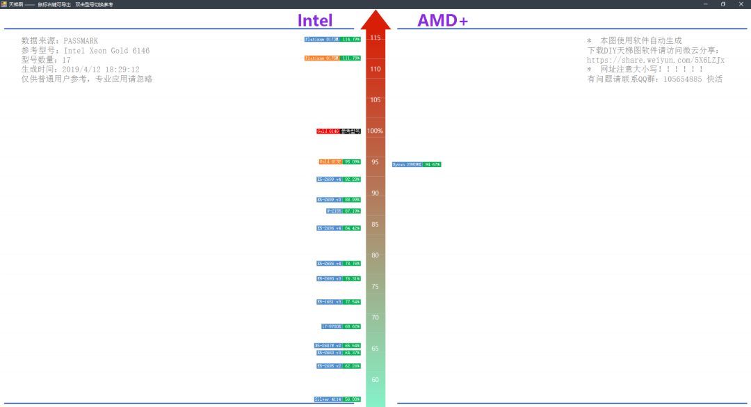 以CPU为例,可以直接看到性能跑分数、频率、功耗、接口、排名等。当然排名第一的肯定是最贵的那个,如果你是土豪请随意,否则可以选择几款你认为可以入手的型号,点击生成天梯图,然后对比,选出最性价比的型号。