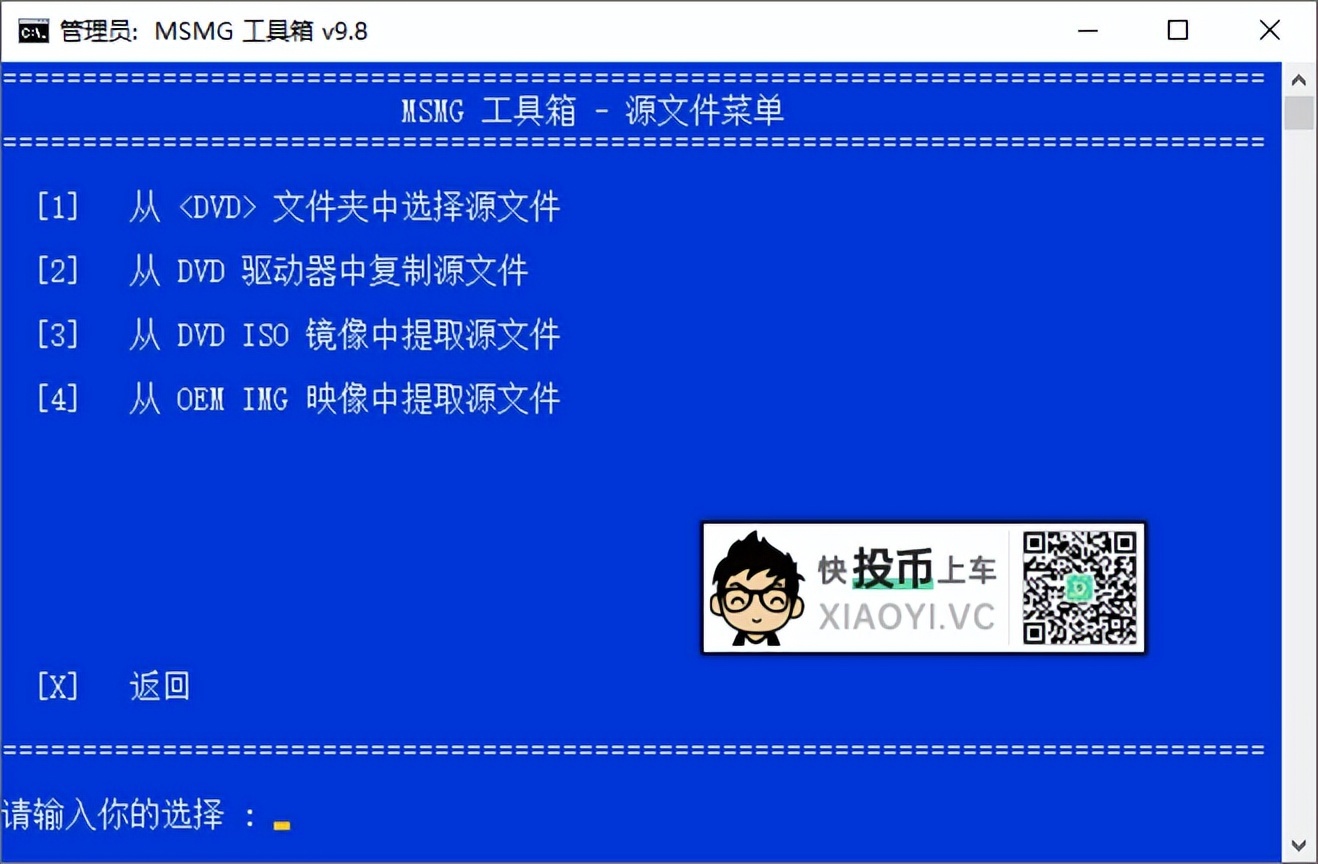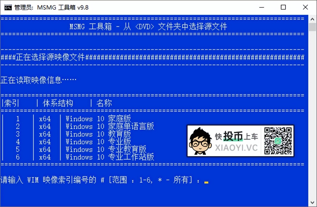 进入「MSMG ToolKit」主菜单后,接着输入 “1” 选择加载「Windows 10」镜像文件。
