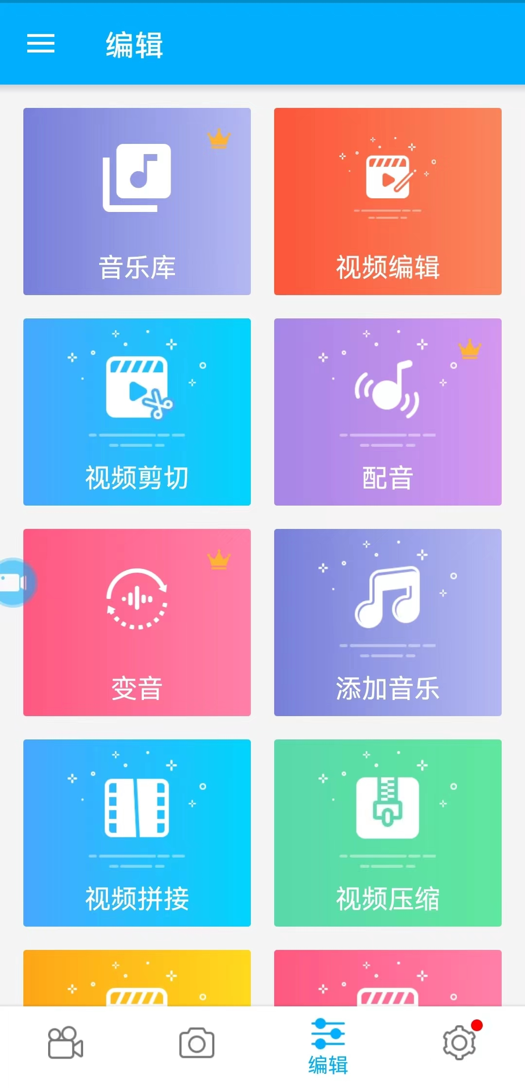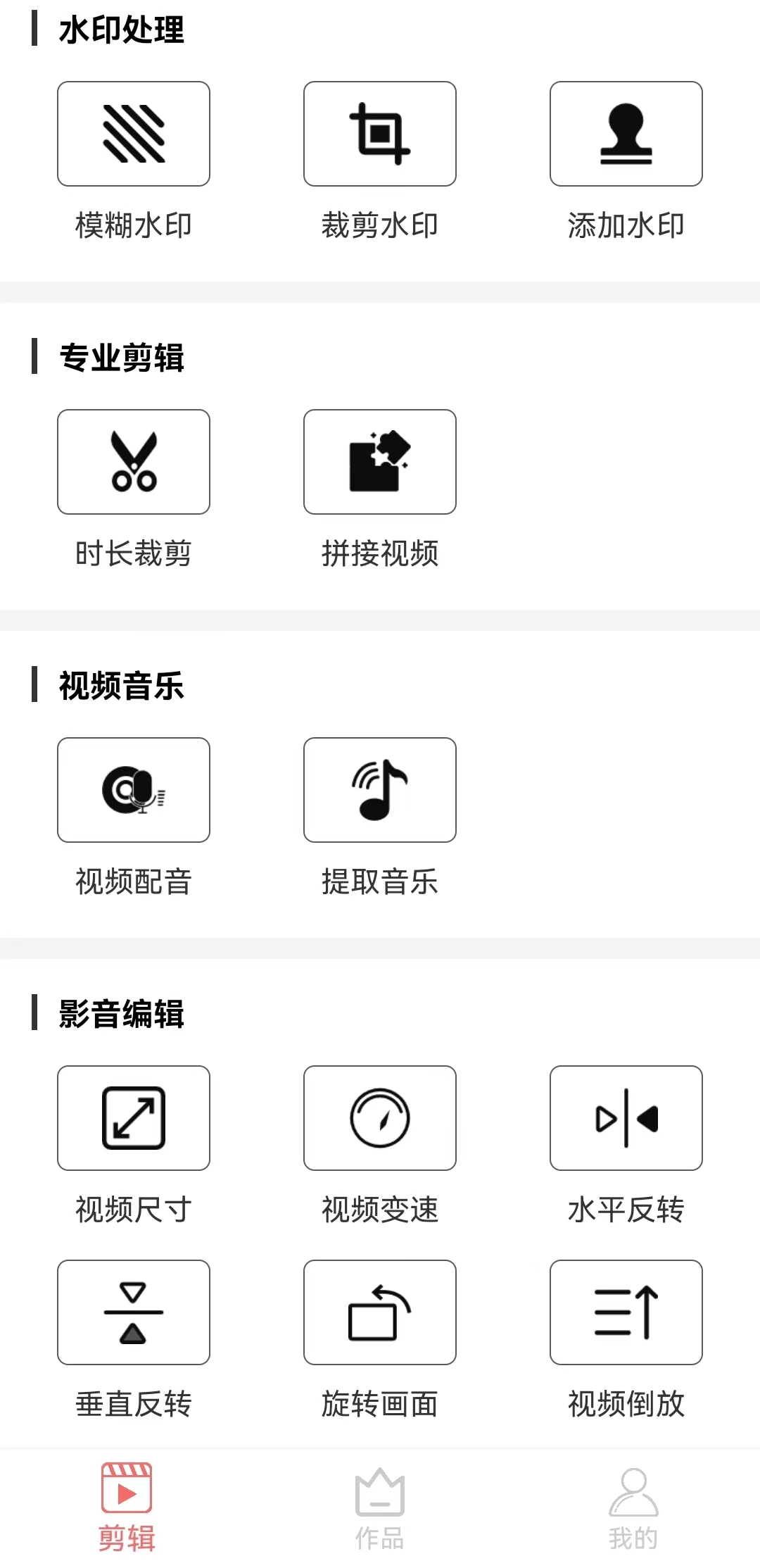 这款 APP 是一款专门用来剪辑视频的后期 APP,不支持录屏功能,可以用于录屏之后的成品视频编辑使用,主要功能分为四大类:水印处理、专业剪辑、视频音乐、影音编辑。
