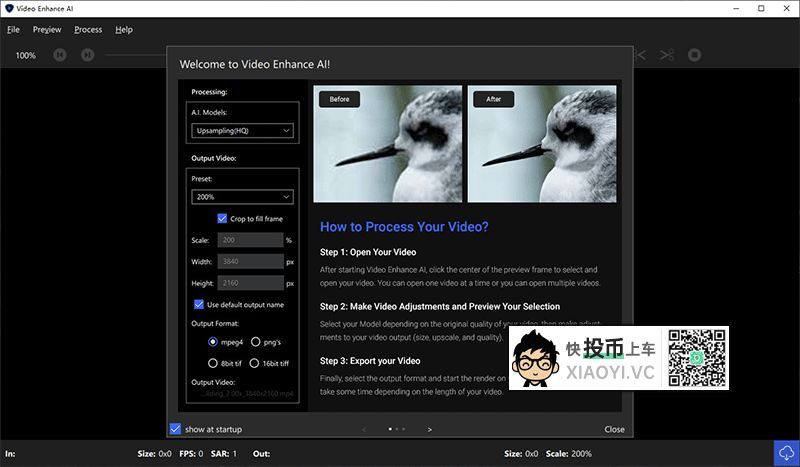 「Topaz Video Enhancer AI」目前没有中文版,好在软件操作也很简单,基本三个步骤完事,打开视频、设置参数、转换输出。首次启动也有教学说明。