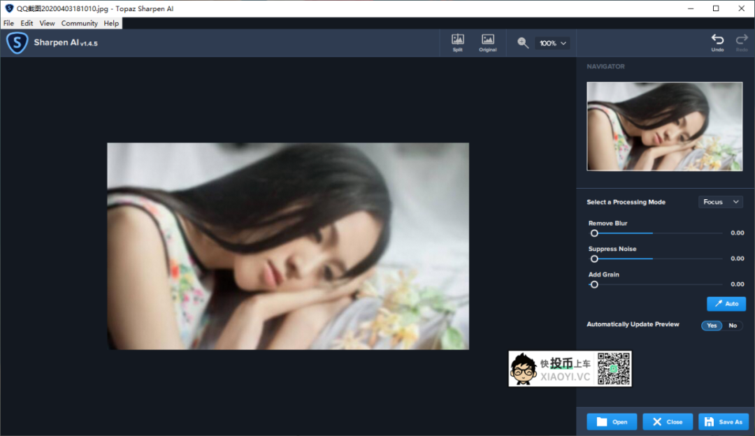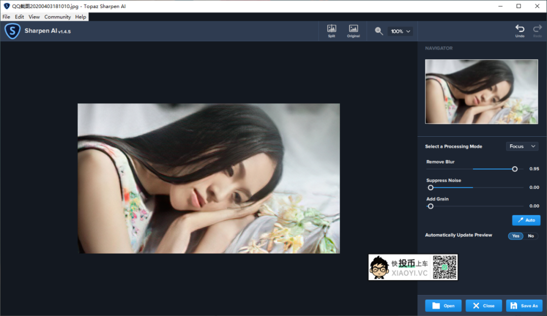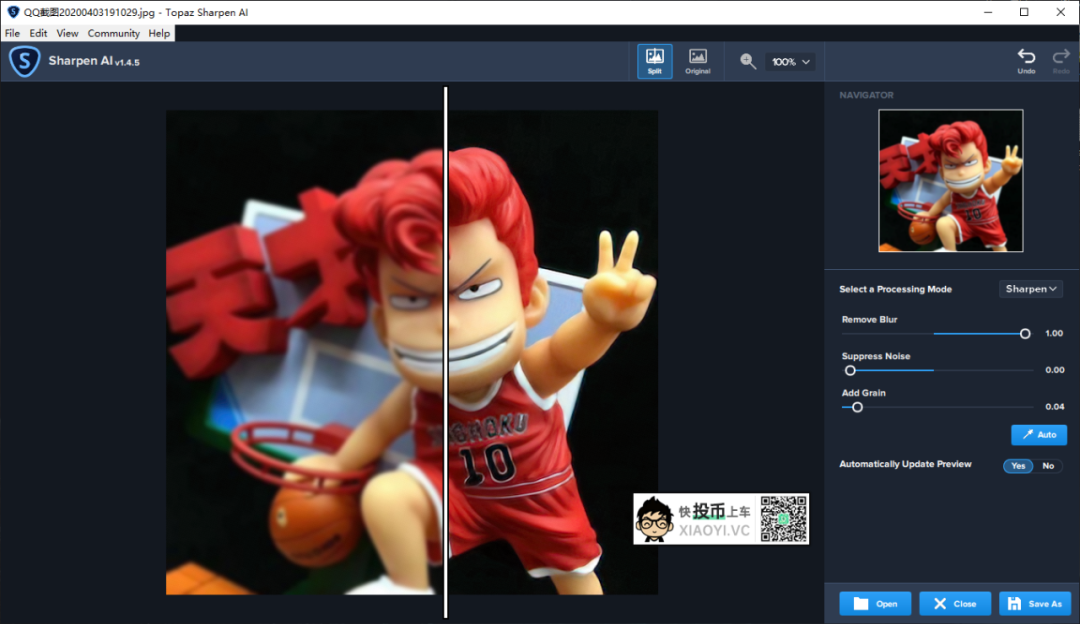 「Topaz Sharpen AI」调整过程也可以点击上面的 “Split” 按钮,来对比照片修复前后的效果。