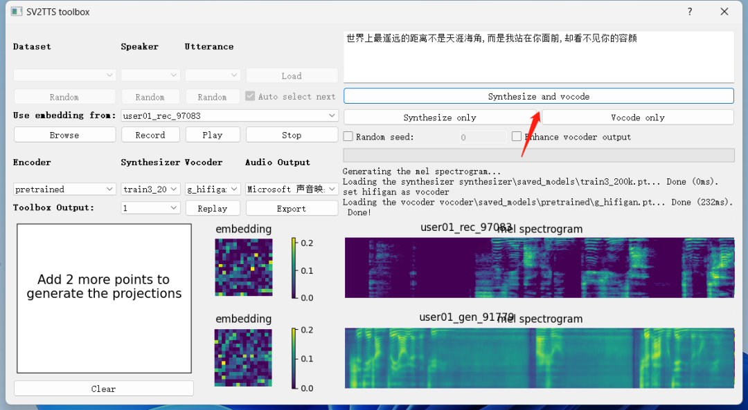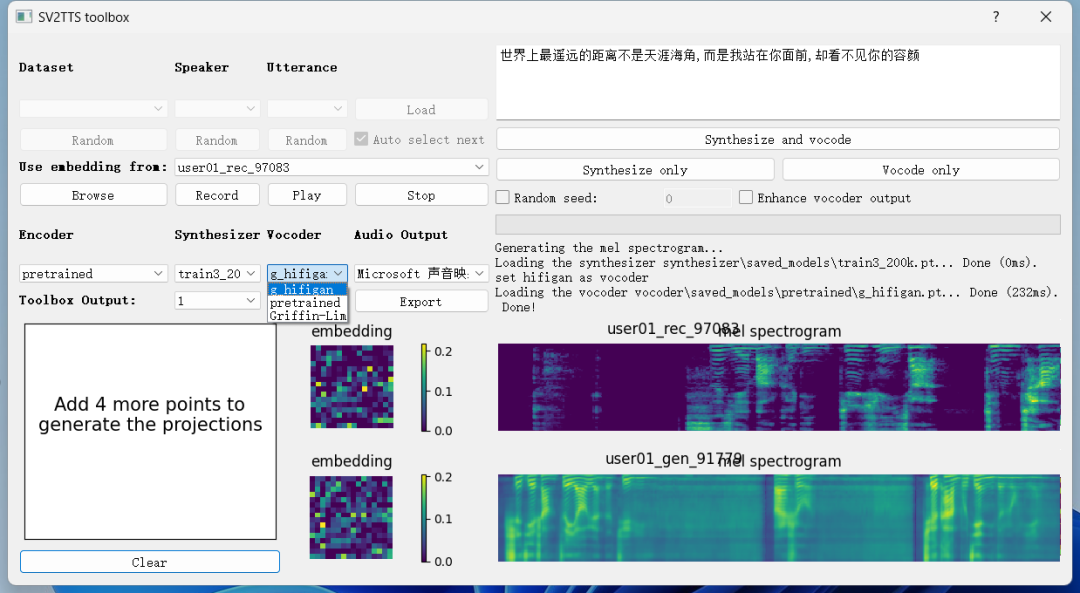 最后点击「Synthesize and vocode」可以合成和编码音频,不过一般来说,最后合成的效果很难做到 100%完美,只能说比较相似,如果觉得效果不够好,可以更换源语音或者切换合成编码器之后重新合成,默认下软件支持三种合成编码器。