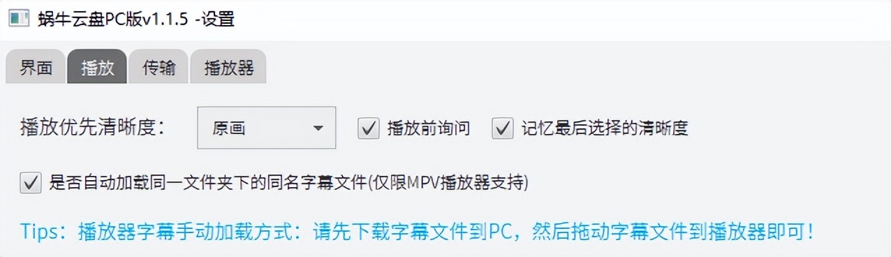 而使用蜗牛云盘内嵌 mpv 播放器,可根据 mpv 特性进行丰富的自定义功能,可选清晰度,支持原画播放。