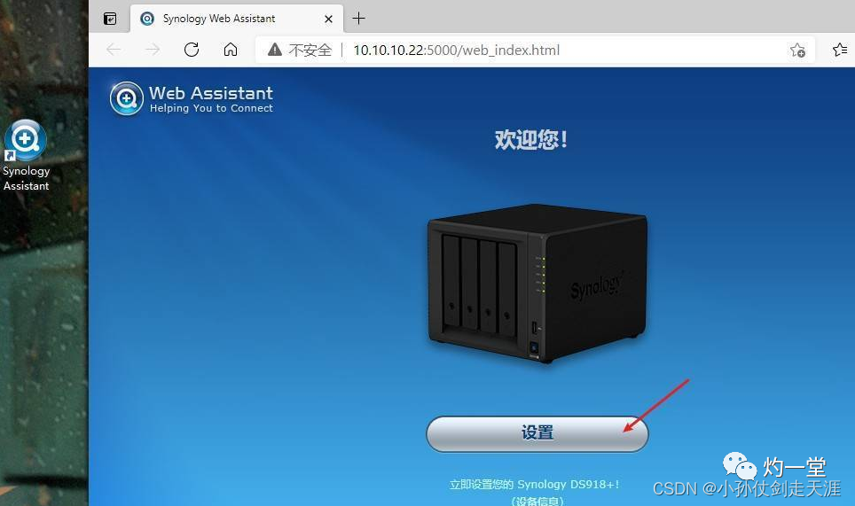 - 我们在浏览器输入www.find.synologu.com或者刚刚查找到的黑群晖IP地址:10.10.10.22就可以进入了群晖的安装界面了,我们点击设置按钮
