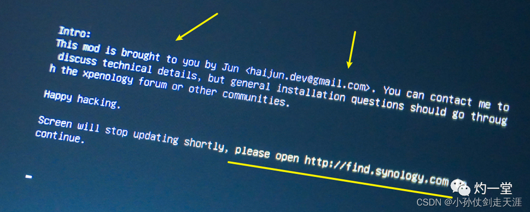 - 当显示器,显示下面这个信息的时候,就代表我们的黑群晖已经安装好了!这个时候,我们就可以拔掉显示器和键盘鼠标了,以后我们这台DIY的NAS,只需要一个U盘,一根网线接在上面即可: