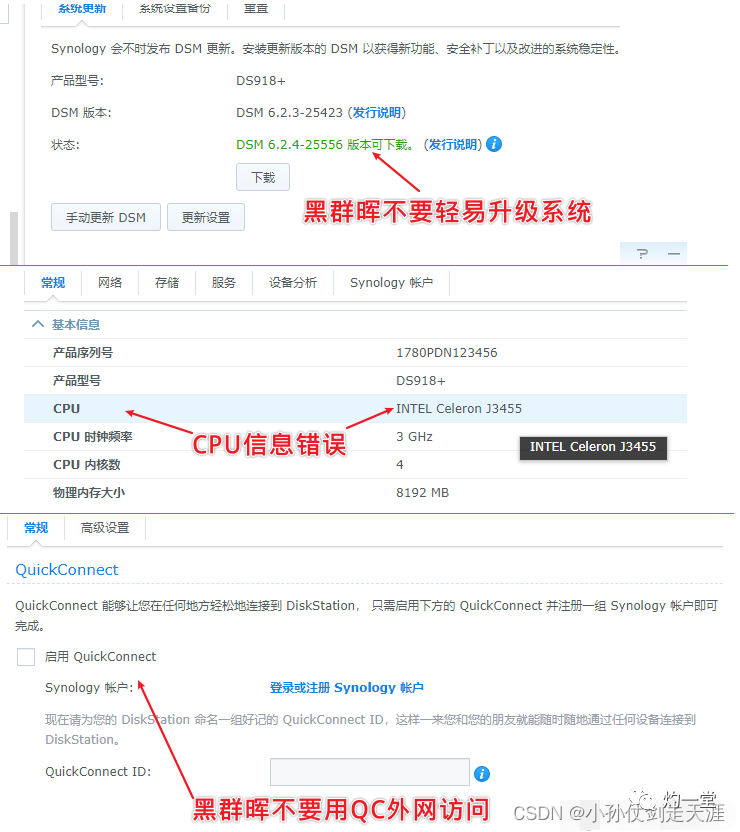 - 第一,黑群晖下的系统,不能轻易升级,否则可能出现进不去系统!但是如果您不小心点了升级,进不去系统了,也可以再重新刷入引导文件,回到旧版本,就可以正常使用了。