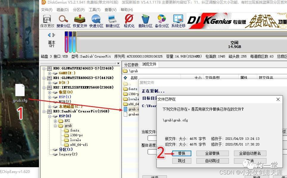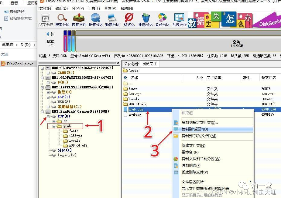 - U盘写入完成后,我们再次打开分区大师工具:可以看到U盘内已经多了一些文件了,我们点击ESP,再点击grub文件夹。在右边,点击 gurb.cfg文件(如果没有VID和PID选项可能需要修改Grubevn这个文件),然后点击右键,复制文件到桌面: