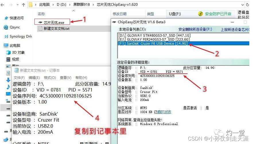 - 我们打开芯片无忧工具,选择到闪迪U盘,可以看到设备ID的地方:我们新建一个本文文档,将这个设备ID,复制到记事本中: