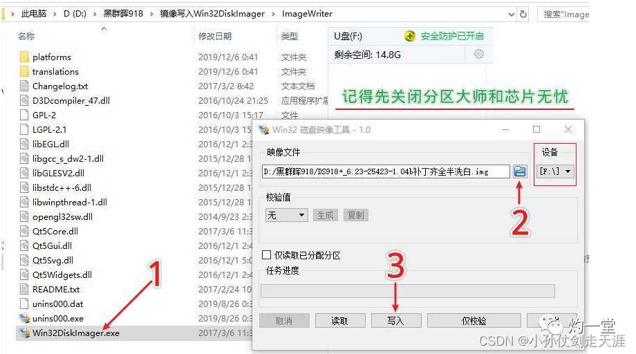 - 确保我们后台没有打开分区大师工具,然后再打开镜像写入工具:选择映象文件,找到 img 结尾的引导镜像,然后设备选择我们U盘的盘符,点击写入