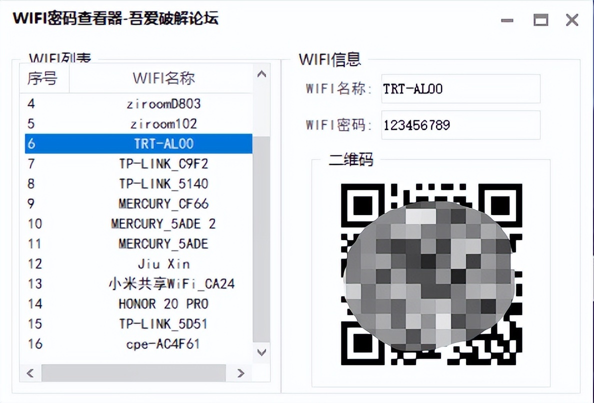 运行软件之后,软件会自动识别系统已经保存过的 WiFi 名称,双击对应 WiFi 名称,会在软件右侧显示密码以及二维码。