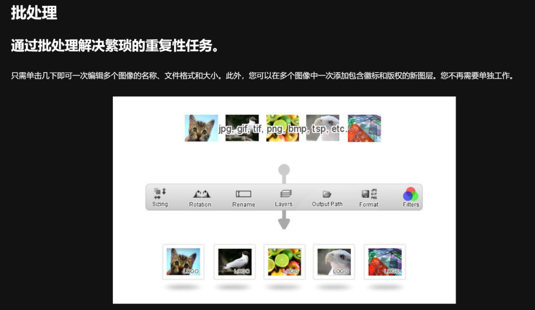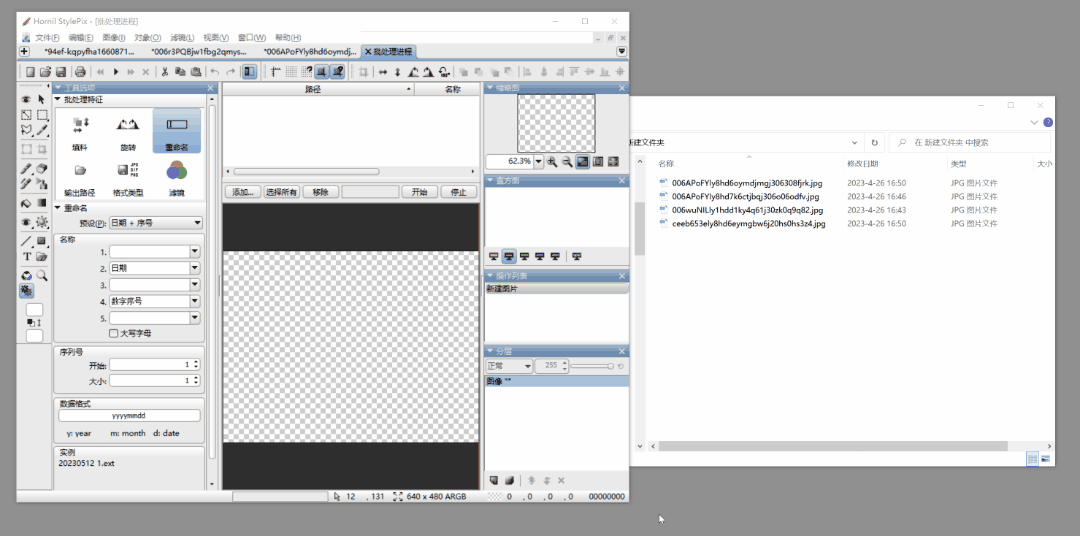 批处理的操作也比较直观,设定好参数,把文件拖进来即可,有重命名、调整尺寸、修改尺寸啥的。
