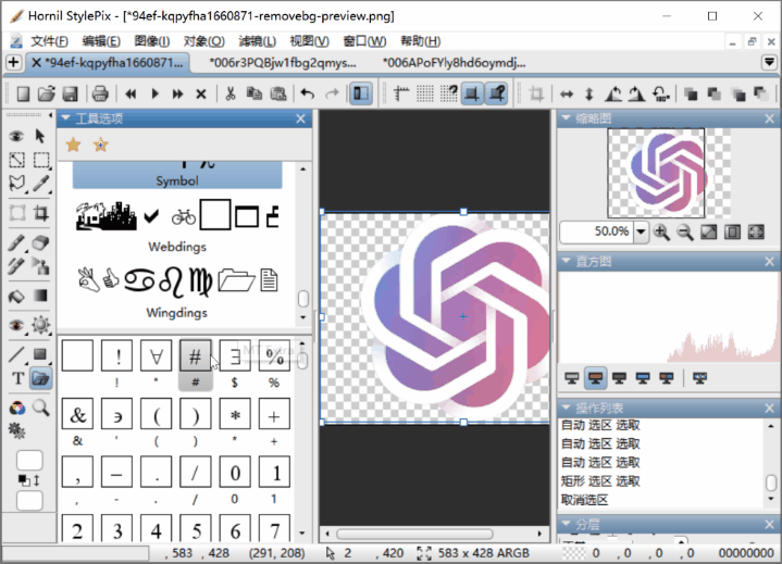 在添加文字的时候,还可以预览字符的样式(不能预览中文),对于一些特殊的字符,可以直接把它们拖到图片上面。