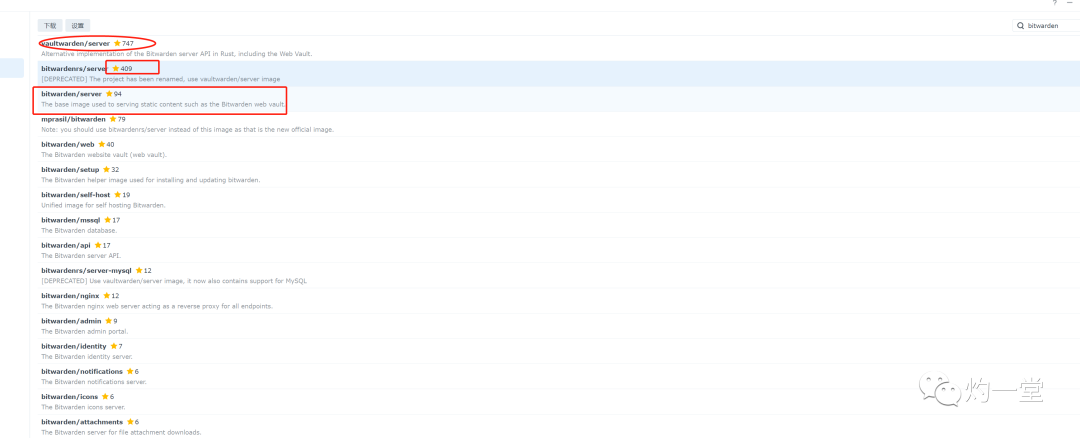 在docker注册表中搜索vaultwarden。可以看到老的bitwardenrs/server已经被DEPRECATED了。第三个是官方的容器镜像,占用系统资源比较多而且没有高级功能,放弃使用。