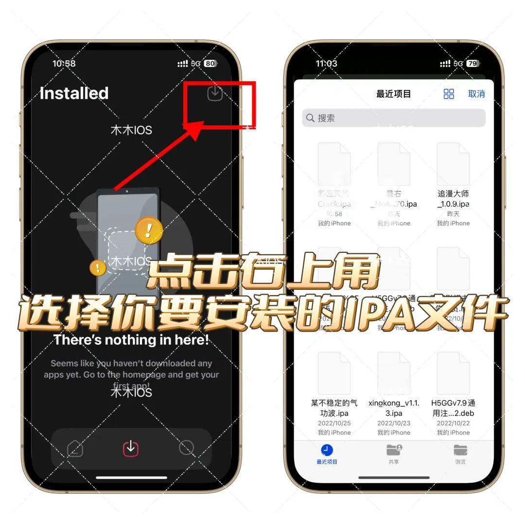 点击右上角,选择【需要安装的ipa】,等待安装,提示【是否安装】,点击【安装】即可安装成功。