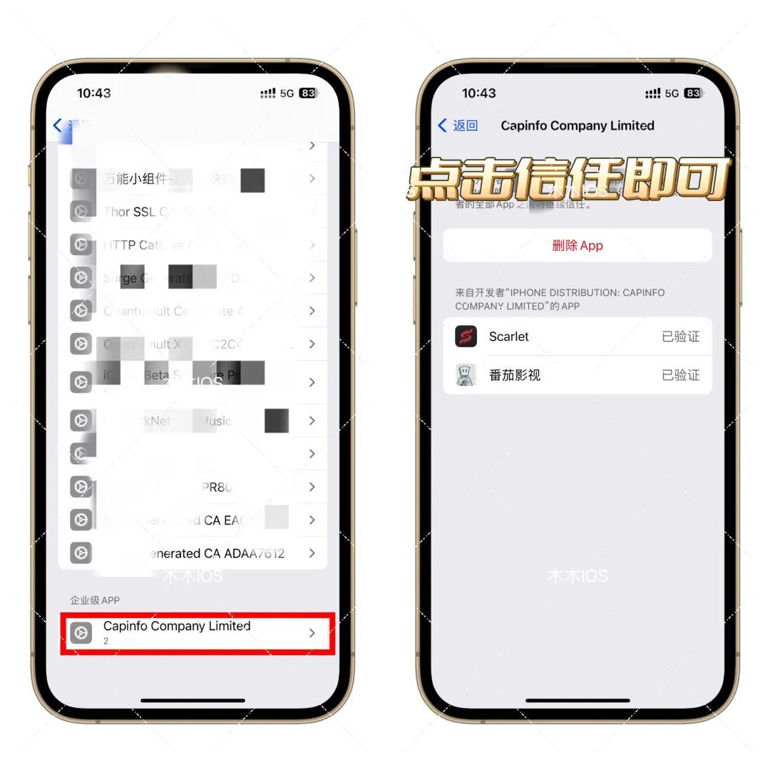 到这里,我们的猩红就安装好了,点击打开会提示 未信任企业级app等,我们进入【设置】,点击【通用】,找到【*与设备管理】,下滑最底【企业级APP】,点击进入并且【信任】即可。