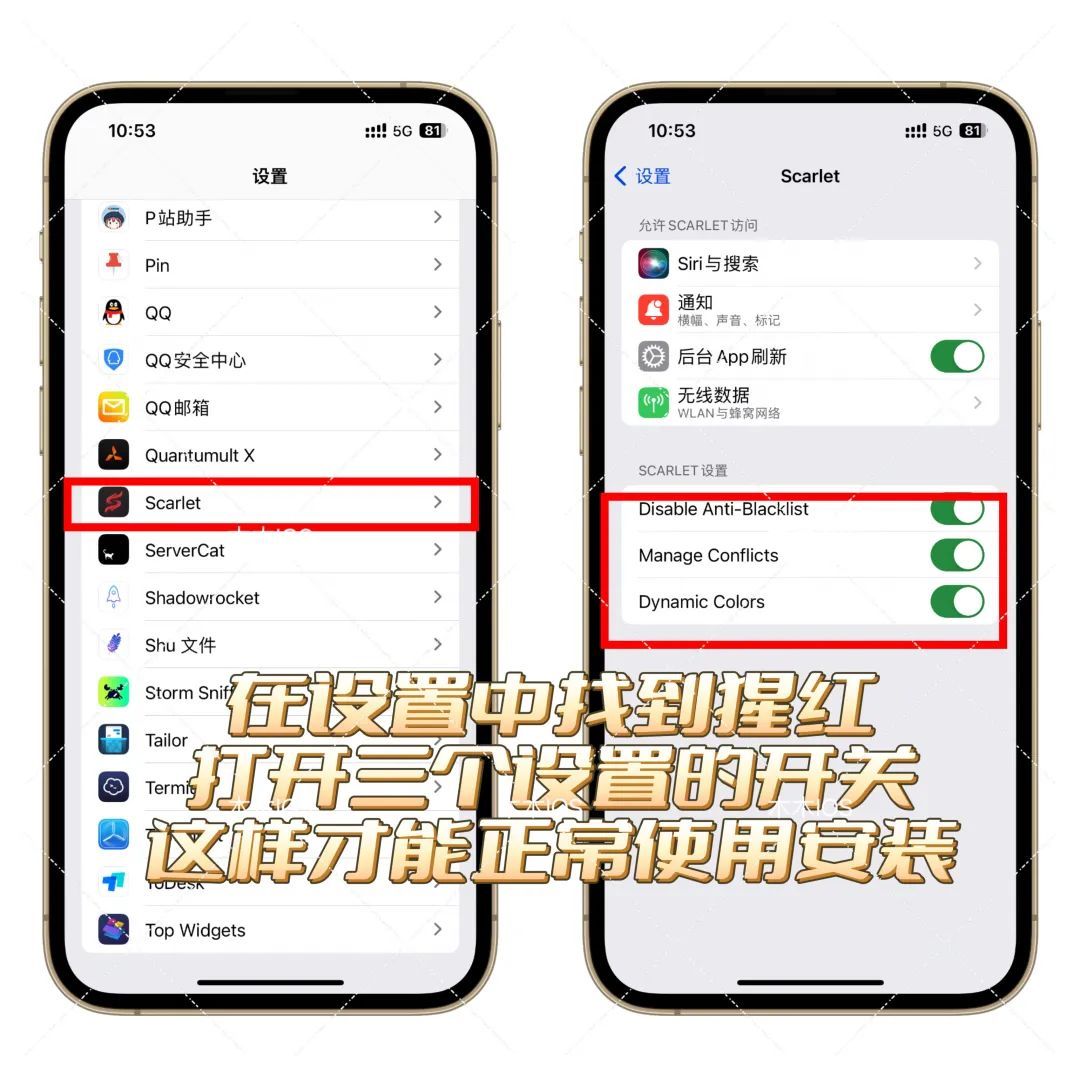 我们在设置中,找到猩红应用,点击进入,将【三个设置开关打开】