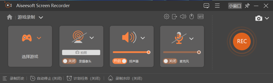 这款录屏软件采用了方块式 UI 设计,录制功能主要可以分成普通桌面的视频录制、音频录制以及游戏录制。