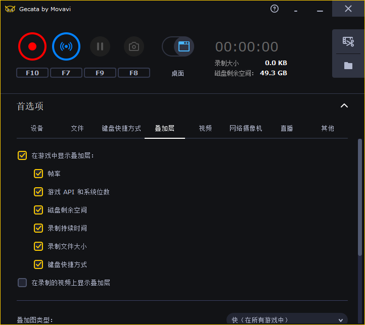 其中,游戏模式下,还能在录制的游戏画面中添加叠加层,用以显示当前录制环境下的各项数据,包括帧率、游戏 api、磁盘剩余空间、录制时长等等。