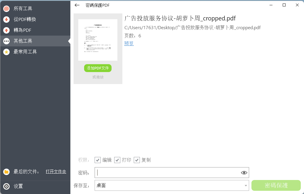 有部分 PDF 因为涉及版权或者私密等原因,需要限制编辑、打印、复制的权限,那么建议使用密码对 PDF 进行保护,也就是加密。