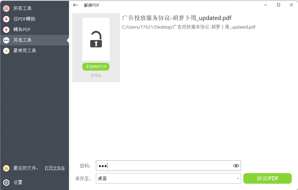 已经加密的文件如需解锁成未加密文件,需要将文件放入解锁工具中,但前提是必须知道文档的加密密码,否则无法解锁。