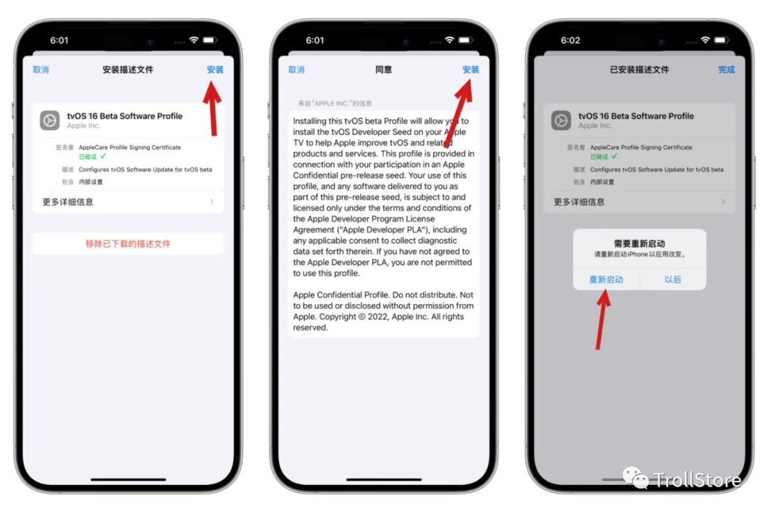 找到开头为profile的文件tvOS16文件并打开(可能有几个,打开看是否为tvOS16) 删除RemovalDate选项保存 即可