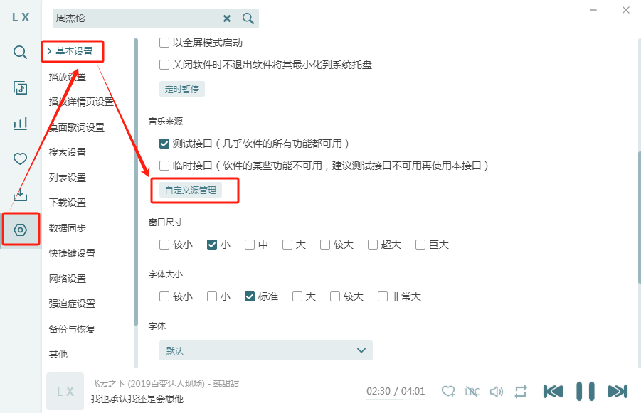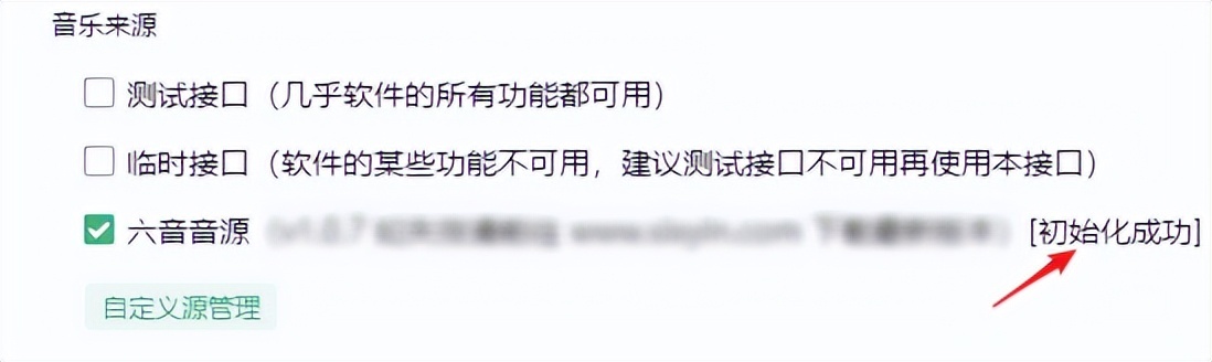 方法也非常简单,打开落雪音乐-设置-基本设置-音乐来源-找到自定义源管理。选择导入六音大佬的第三方音源。