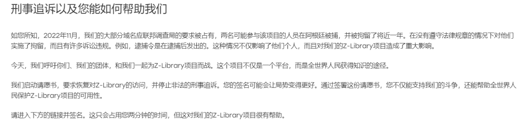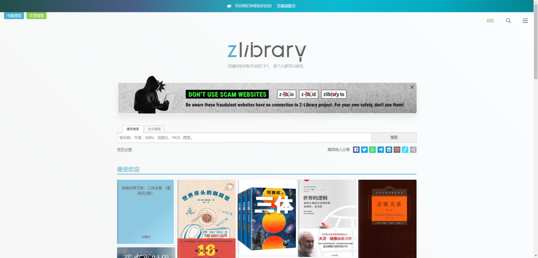2022年的时候,Z-Library的两名运营者被FBI逮捕,被拘留了1年,大部分域名也被封杀。然鹅,通往知识的大门的是自由的,Z-Library网站前赴后继,网站的顶部宣传语:支持我们争取知识自由!