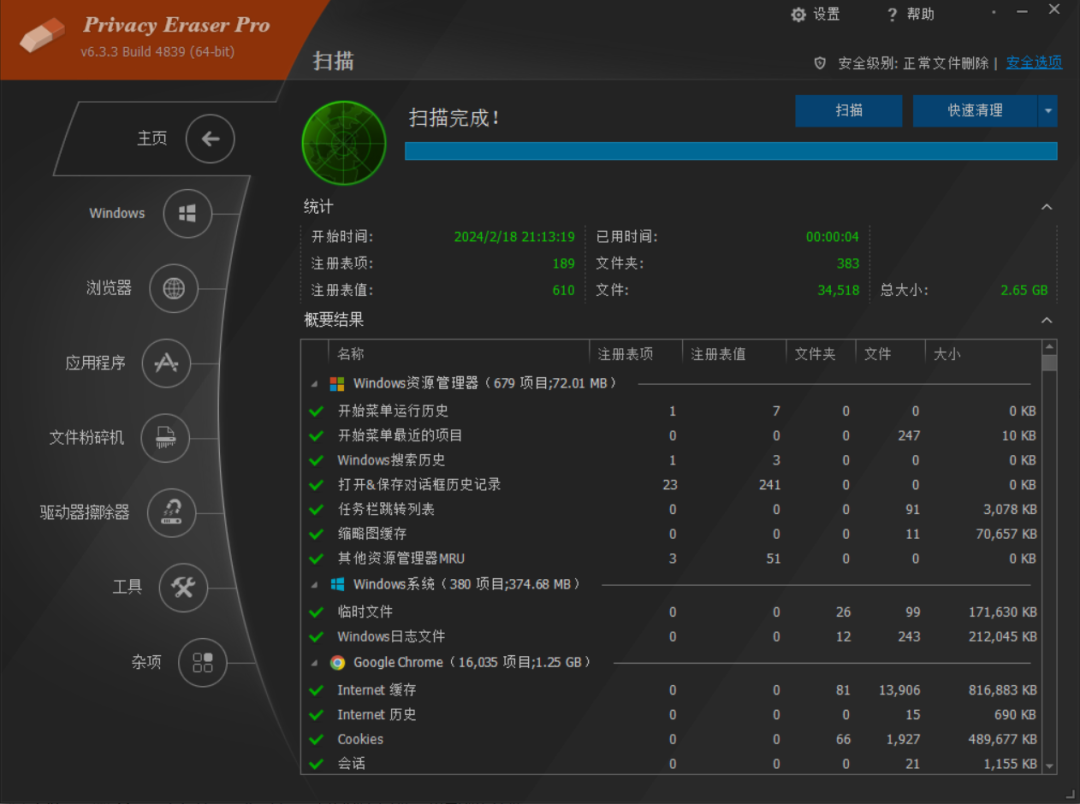 使用电脑都会留下痕迹,时间久了就会产生一些垃圾文件,适当的清理和优化是必要的,有时使用电脑的过程中还会有一些隐私数据,比如一些浏览记录、保存的密码、保存的小姐姐等,时间一久可能自己都会忘记。今天推荐一款名为Privacy Eraser Pro(隐私橡皮擦专业版),通过清理足迹来保护隐私,超过了美国国防部和国家安全局的清理标准,一旦删除,文件数据将永远消失,且无法恢复。