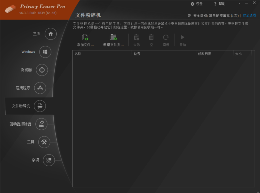 在安全选项中可以设置多个级别:正常文件删除、简单的零填充、美国国防部级别…级别的设置可以设置全局的级别,也可以设置文件粉碎机的级别、磁盘驱动器擦除级别。