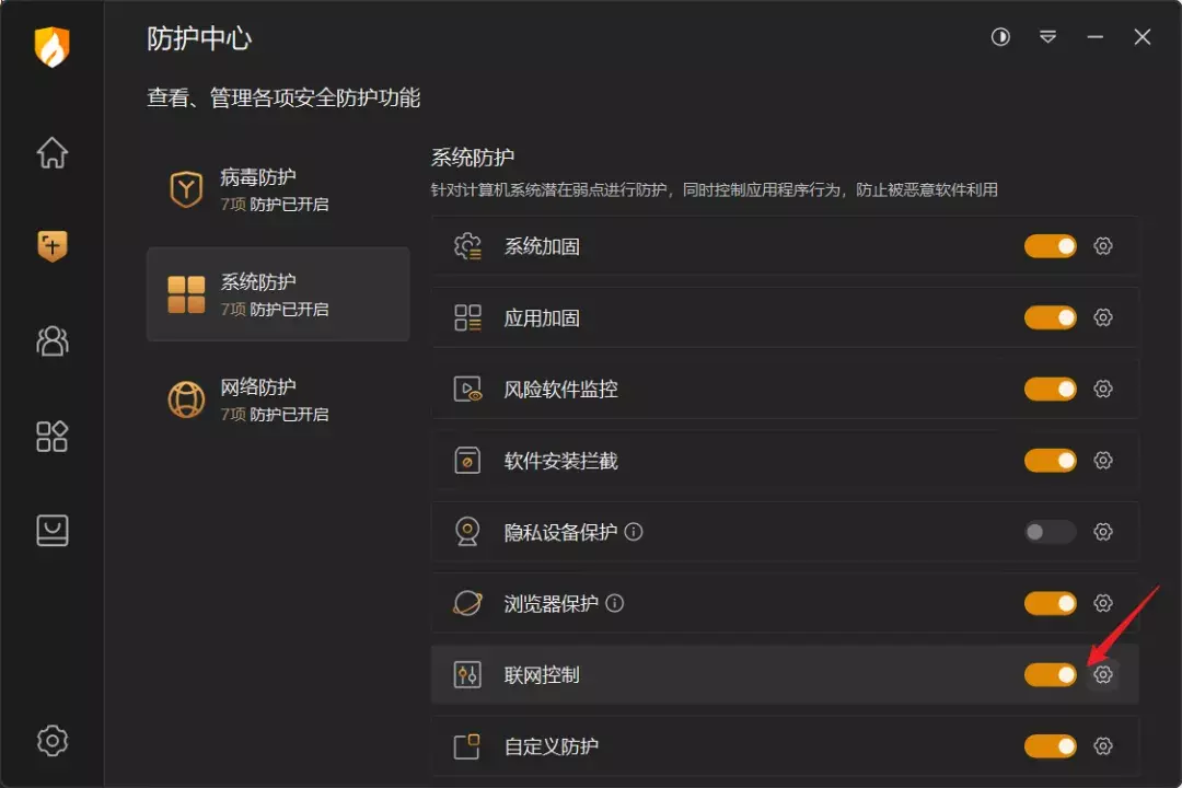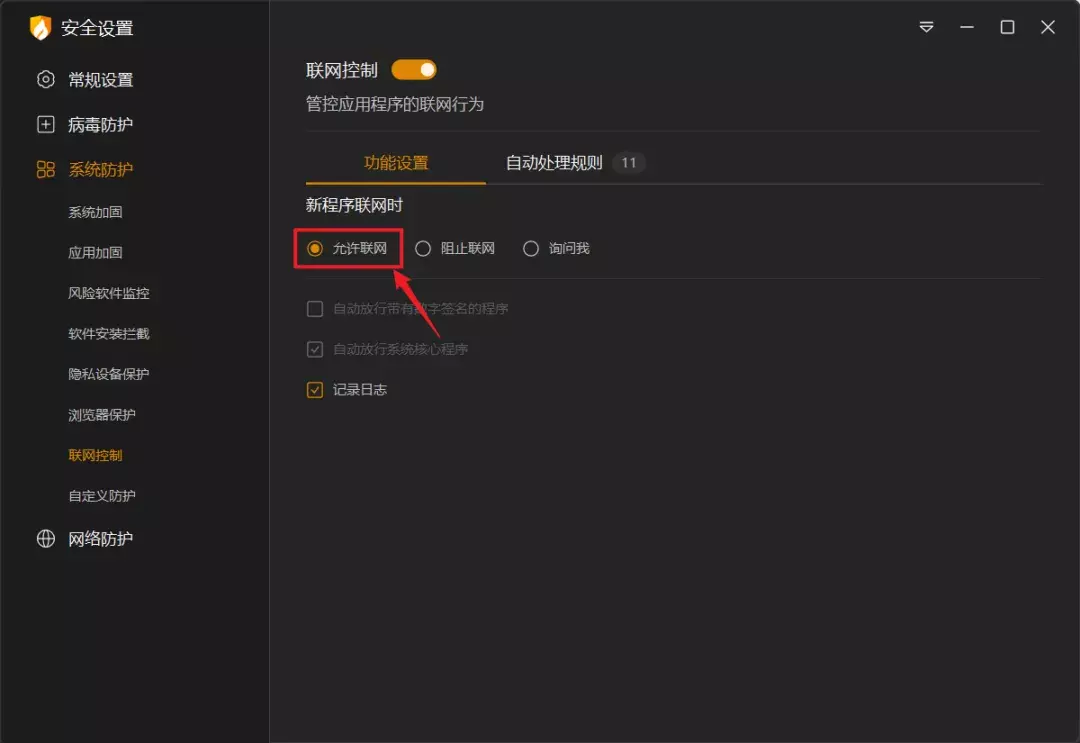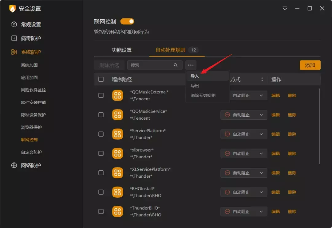 「联网控制」该规则需要首先将联网控制的开关打开:点击防护中心图标→系统防护→联网控制。然后点击旁边的设置按钮,在自动处理规则标签下,将规则导入。