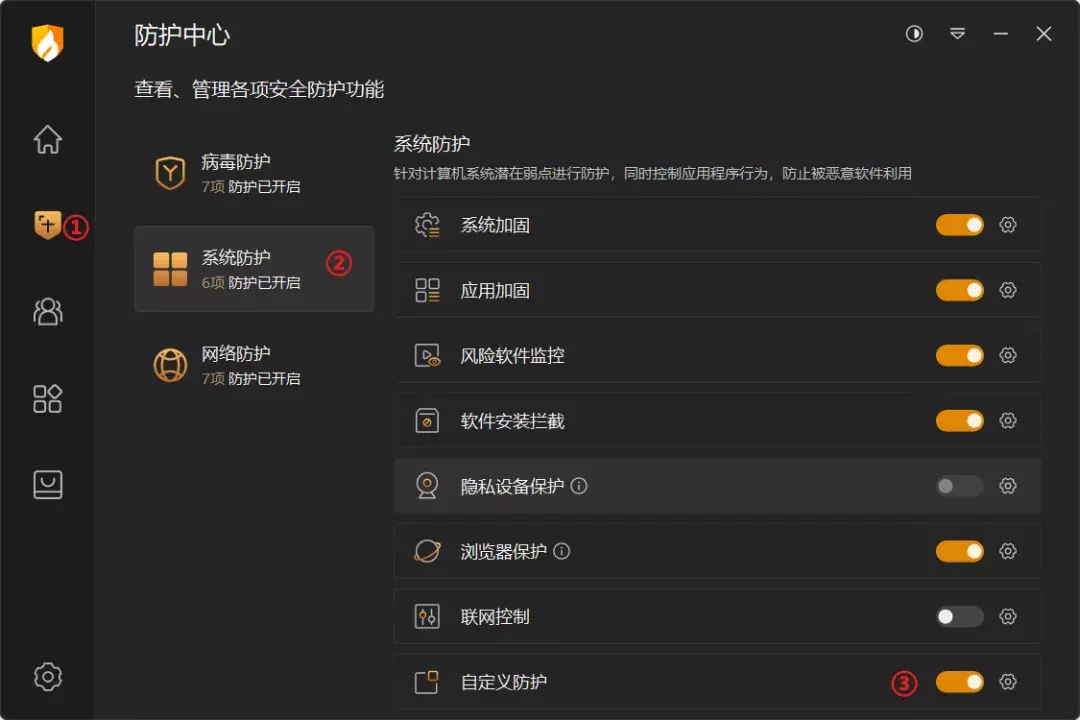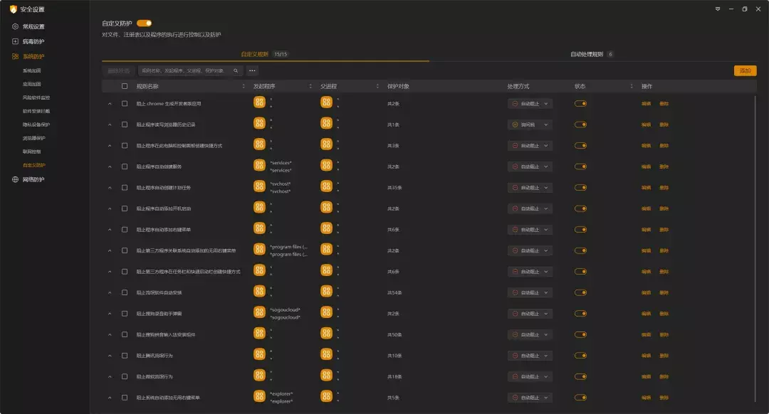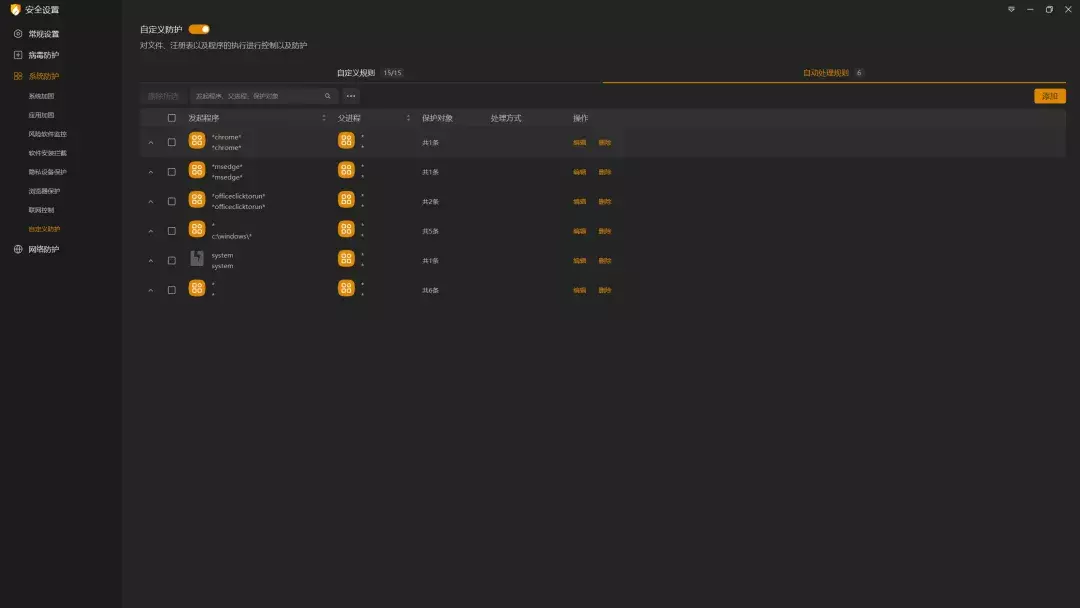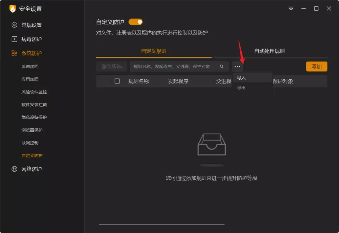 使用方法:点击防护中心图标→系统防护→自定义防护,将开关开启。然后点击旁边的设置按钮,这里面有自定义规则和自动处理规则,我们分别导入。