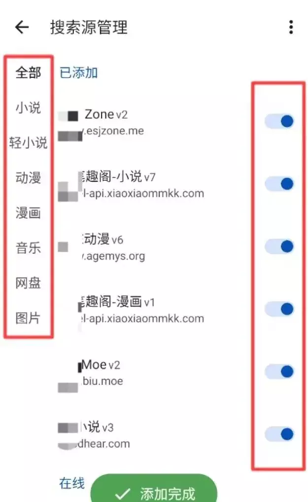 无需用户满世界查找源,APP 提供了一部分可用的源,只不过默认不启用,选择一部分小说、音乐、动漫、图片源添加进来。