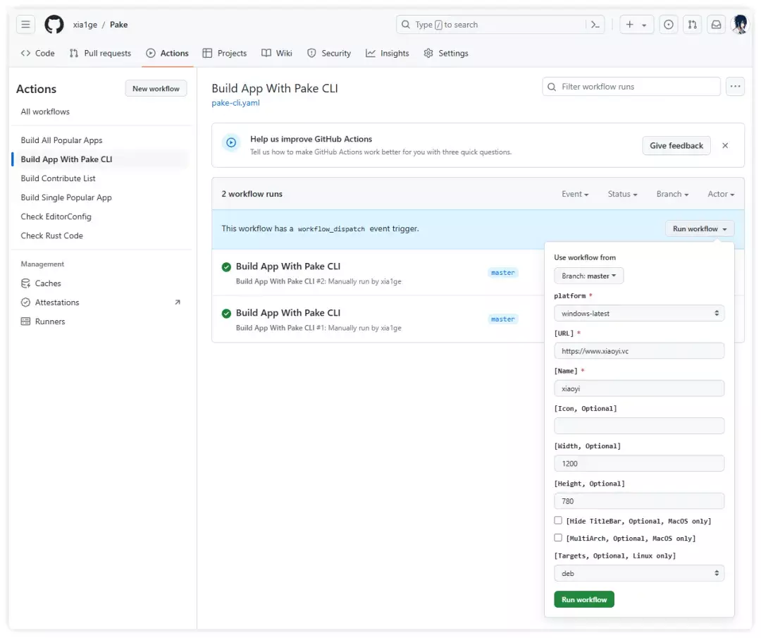 如果你是新手小白,可以直接用 Github 在线编译的方式,先 Fork 项目,然后前往 Actions 界面,选择 Build App with Pake-Cli,填写表单信息,点击 Run Workflow 即可。