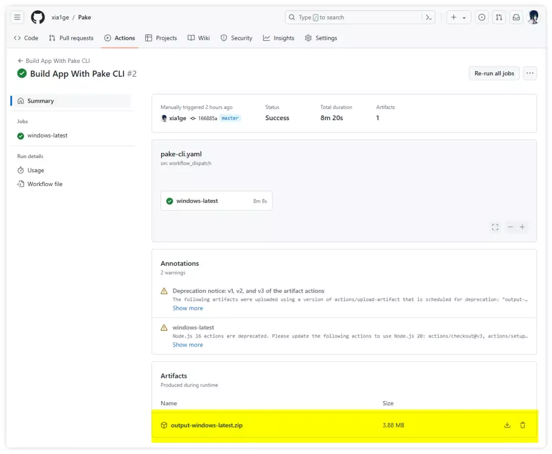 出现绿色小图标则代表打包成功,可以点击 Build App with Pake-Cli 查看打包详情和附件。