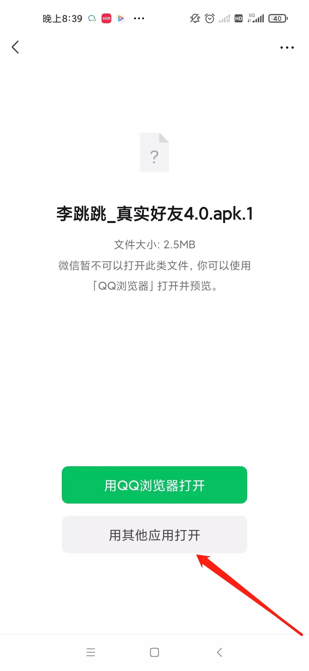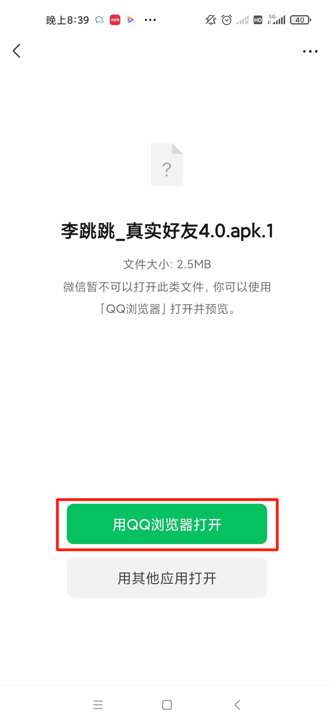 隔壁QQ点一下就能安装,反而到了微信直接修改成apk1了,这个功能纯粹的给用户制造麻烦,以安全为名义,实际就是为了推广【QQ浏览器】,而这一过程产生的成本全都转移到了普通用户身上了。